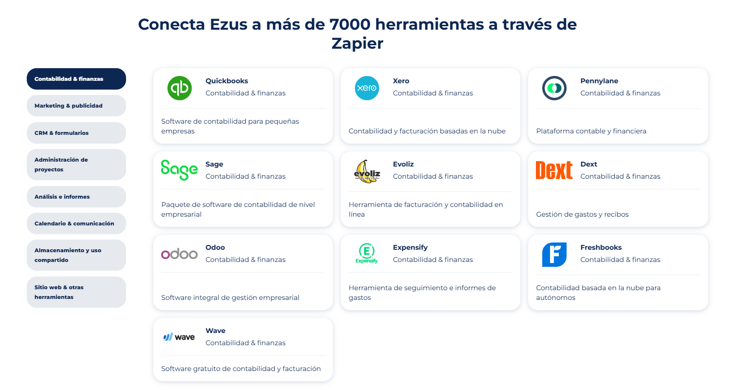 Ezus se conecta con los principales softwares contables del mercado a través de API, Zapier e integraciones nativas: